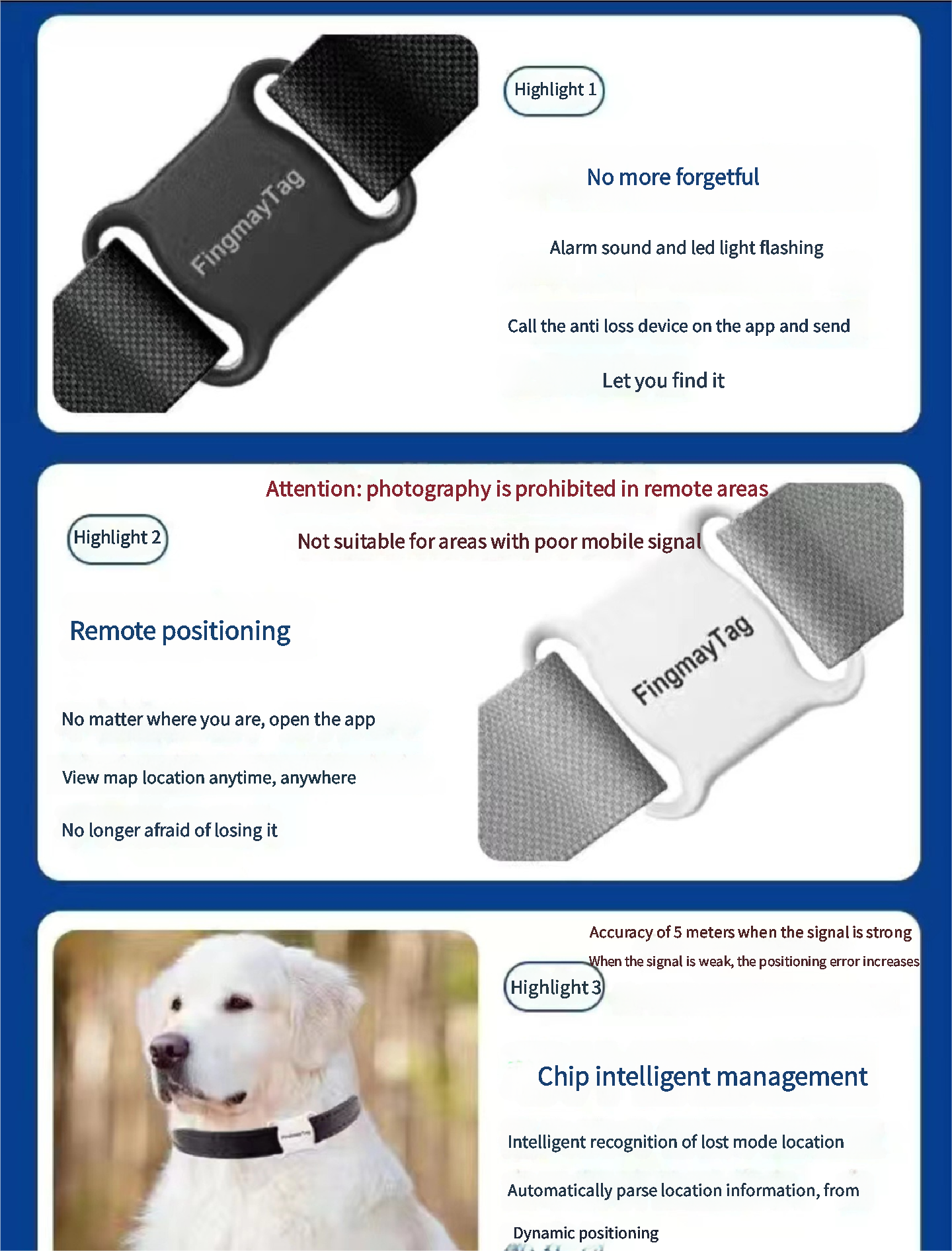 This product is recommended for users living in county-level cities and above. Photographing is prohibited in rural towns and remote areas, as sparse populations make it more difficult to locate lost pets.